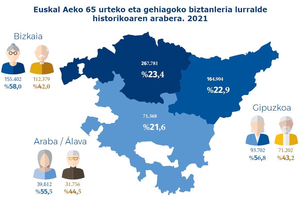 2021/01/01eko zifrek adierazten dute Euskal AEn 65 urtekoak eta gehiagokoak biztanleria osoaren % 23 izan zirela: haietatik, % 57,3 emakumeak (288.716) eta % 42,7 (215.337) gizonak.
