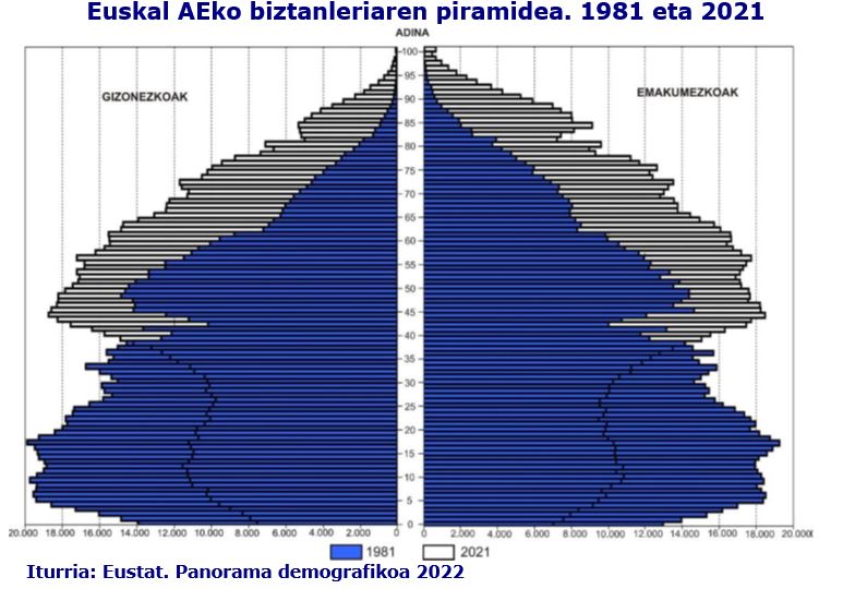 Azken lau hamarkadotan, 1981aren eta 2021aren artean, 65 urteko eta gehiagoko biztanle kopurua 2,5 aldiz biderkatu da Euskal AEn, eta, aldi berean, adin-tarte gazteenetako biztanle kopuruan beherakada etengabea da.