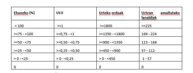 Taula honetan, ULU tarteen, urtean lan egindako orduen eta lanaldi osoko lanaldien arteko baliokidetasunak agertzen dira: