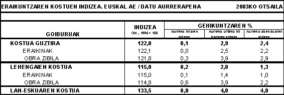 2003ko otsailean, Euskal AEko Eraikuntzaren Kostuen Indize Orokorra %0,1 igo zen eta otsailerako urte arteko tasa %2,9ra iritsi zen, Eustaten datuen arabera. Lehengaien kostuaren hazkundeak (%0,2) markatu du otsaileko indize orokorra, beste osagaia, lan-eskuaren kostua ez baita aldatu aldi horretan.