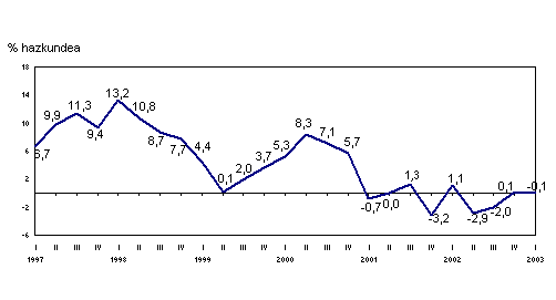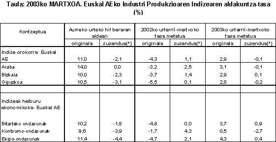 2003ko martxoan, urte arteko aldakuntzarik positiboenak sektore hauei egokitu zaizkie: ehungintza eta jantzigintza (%24,4), kimika-industria (%18,7), material elektrikoa (%17,8), kautxua eta plastikoa (%17,5), garraio-materiala (%14,8), metalgintza eta metalezko gaiak (%11,4) eta ez-metalezko industria (%11,1) arloei, besteak beste.