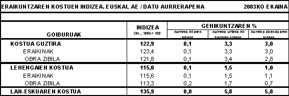 Sektoreak kontsumitutako lehengaien artetik, 2003ko ekainean, hauek izan dituzte inflazio-tasarik handienak: karea, igeltsua eta eskaiola (%5,6), petroliotik eratorritakoak (%2,7) eta harri landua (%1,8) lehengaiek. Bestalde, hileko batez besteko prezioen jaitsiera izan dute honakoek: asfalto-produktuak (%-4,2), energia elektrikoa (%-2,0) eta kristala (%-1,6) lehengaiek, besteak beste.