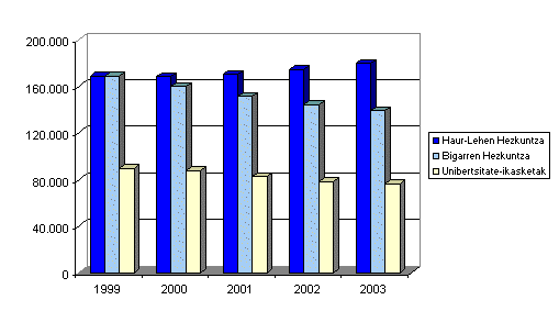 Haur Hezkuntzan, D ereduan ikasleen % 61,4k egin zituzten ikasketak; B ereduan, % 28,6k; eta A ereduan, % 9,3k baino ez. Lehen Hezkuntzan ere, D eredua hartu zuten gehienek, ikasleen % 51,8k; B eredua izan zen bigarren, % 29,7rekin; eta A eredua hirugarren, % 17,7rekin. Bai DBHn, bai Batxilergoan, euskaraz ikasi zuten ikasleak % 40 baino gehixeago izan ziren; Lanbide Heziketan, berriz, kopuru apalagoa, % 13,6. Edonola ere, oro har, maila guztietako joera da D ereduan aurreko urtean baino ikasle gehiago matrikulatzea.