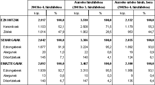 2003ko laugarren hiruhileko horretako 2.117 ezkontzetan, bizilekua Euskal Autonomia Erkidegoan duten 2.042 gizonezko eta 2.092 emakumezko ezkondu ziren. Horietatik 1.877 senarrentzat (%91), lehen ezkontza izan zen; 20 alargun eta 145 dibortziatu, aldiz, berriro ezkondu ziren. Lehen ezkontza zuten emakumeen ehunekoa gizonezkoena baino zertxobait altuagoa izan zen: aurretik ezkongabeak ziren emakumeak 1.939 (%92,7) izan ziren; alargunak, 13; eta dibortziatuak, 140.