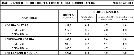 Sektoreak kontsumitutako lehengaien artetik, azken hamabi hilabeteetan, hauek izan zituzten inflazio-tasarik handienak: metalezko hoditeria (%23,6), burdina eta altzairua (%15,8), petroliotik eratorritakoak (%9,0), asfalto-produktuak (%8,2) eta karea, igeltsua eta eskaiola (%8,0) lehengaiek. Bestalde, urteko arteko prezioetan (2004ko apirila, 2003ko apirilaren gainean), murrizketak izan zituzten energia elektrikoa (%-8,5), harri elaboratua (%-5,0), bulego-materiala (%-3,4) eta leherkariak eta gasak (%-1,8) lehengaiek.