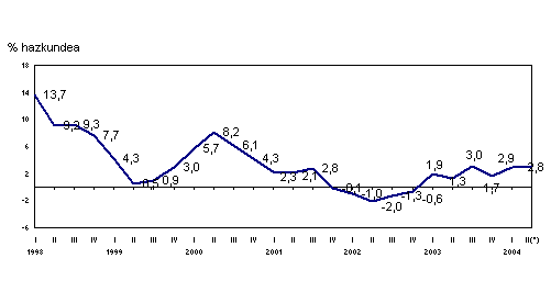 2004ko apirilean, %2,6 hazi zen Euskal AEko industri jarduera, balio absolututan, 2003ko hil beraren aldean, EUSTATek landutako datuen arabera. Balio homogeneotan, urte arteko aldakuntza %2,7ra iritsi zen. 2004ko lehenengo lau hileko hazkunde metatua %3,5ean kokatu zen, balio absolututan, aurreko urteko aldi beraren aldean; eta %2,8ko hazkundea izan zen, urte arteko alderagarritasuneko balio egokituetan.