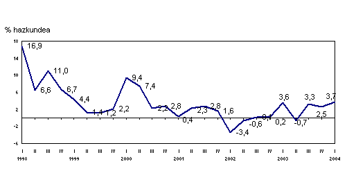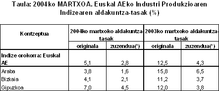 Ondasunen helburu ekonomikoari begiratuz egiten den sailkapen berriaren arabera, 2004ko martxoan, nabarmen igo zen urte arteko tasa energia adarrean (% 45,4). Bitarteko ondasunetan (% 2,3) eta kontsumo-ondasunetan (% 2,5) ere gehitu zen, baina neurritsuago (kontsumo ez-iraunkorreko ondasunetan % 3,2 igo zen eta kontsumo iraunkorreko ondasunetan % 1,0, baina ekipo-ondasunetan % 0,1 jaitsi zen). Lehen hiruhilekoan, eta aurreko urteko aldi bereko datuekin alderatuta, energia adarrak % 33,5eko hazkunde metatua du, bitarteko ondasunek % 2,9ko igoera izan dute, eta ekipo-ondasunek, aldiz, % 0,5 egin dute atzera. Kontsumo-ondasunak ere jaitsi dira (% -3,3), eta honela banatzen da jaitsiera kontsumo iraunkorreko ondasunen eta kontsumo ez-iraunkorreko ondasunen artean: % -4,7 eta % -2,5, hurrenez hurren.