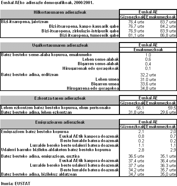 Probintziaka, alde handia dago Bizkaiaren eta Gipuzkoaren, batetik, eta, bestetik, Arabaren artean. Araban migrazioak 1,4 dira gizonezko zein emakumezkoen kasuan; Gipuzkoan, ordea, 1,8 dira gizonezkoenak, eta 1,9 emakumezkoenak, eta Bizkaian 2 migrazio bi sexuen kasuan. Alde horien kausa probintzia barruko mugikortasuna da, Gipuzkoan mota horretako mugimenduak 1,1 direlako, eta Bizkaian, 1,2 baino gehiago. Araban, aldiz, ozta-ozta iristen da 0,5 mugimendutara. Gainerako mugikortasun-motetan, indizeak nahiko antzekoak dira.
