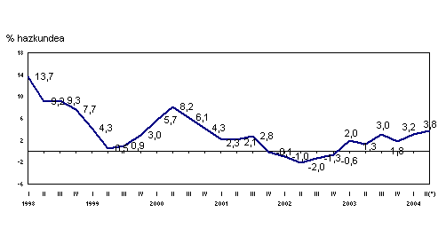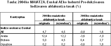 2004ko maiatzean, urte arteko aldakuntzarik positiboenak, balio absolututan, sektore hauei egokitu zitzaizkien: energia elektrikoa, gasa eta ura (%26,1), material elektrikoa (%14,9) papera, argitalpena eta arte grafikoak (%8,5), kautxua eta plastikoa (%7,3) eta garraio-materiala (%5,4) arloei, besteak beste. Urte arteko hazkunde-tasa negatiboak, berriz, honako hauek izan zituzten: ez-metalezko industria (%-32,2), metalezko eta ez-metalezko meak (%-25,5), larruaren eta oinetakoen industria (%-12,8), bestelako manufakturak (%-4,8), zurgintza (%-2,6) eta elikagai-industria (%-0,5) arloek, batik bat.