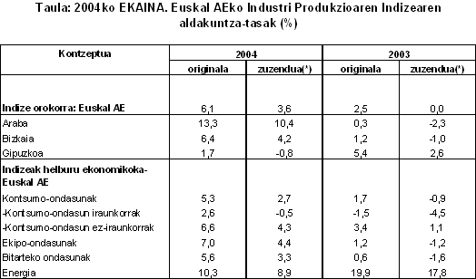 2004ko ekainean, %6,1 hazi zen Euskal AEko industri produkzioa, balio absolututan, 2003ko hil beraren aldean, EUSTATek landutako datuen arabera. Balio homogeneotan, urte arteko aldakuntza %3,6ra iritsi zen. 2004ko lehenengo sei hileko hazkunde metatua %4,3an kokatu zen, balio absolututan, aurreko urteko aldi beraren aldean; eta %3,4ko hazkundea izan zen, urte arteko alderagarritasuneko balio egokituetan.