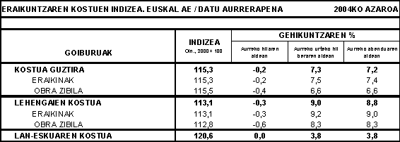 Sektoreak kontsumitutako lehengaien artetik, azken hamabi hilabetean, hauek izan dira inflazio-tasarik handienekoak: metalezko hodiak (% 43,1), burdina eta altzairua (% 39,1), asfaltozko produktuak (% 24,8), petroliotik eratorriak (% 18,2) eta zementutik eratorritako gaiak (% 9,8), batik bat. Bestalde, murrizketak izan dituzte urte arteko prezioetan (2004ko azarokoak, 2003ko azarokoekin alderatuta) lehengai hauek: beira (% -1,7), bulegoko materiala (% -1,0), energia elektrikoa (% -0,8) eta zura eta kortxoa (% -0,3) lehengaiek, alegia.