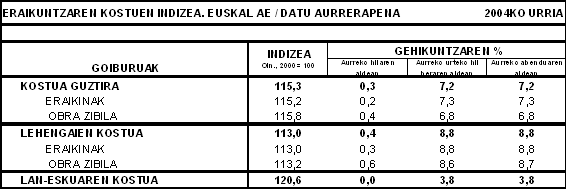 Sektoreak kontsumitutako lehengaien artetik, azken hamabi hilabeteetan, hauek izan zituzten inflazio-tasarik handienak: metalezko hoditeria (%41,2), asfalto-produktuak (%37,6), burdina eta altzairua (%36,0), petroliotik eratorritakoak (%28,9%) eta zementutik eratorritako gaiak (%9,8) lehengaiek. Bestalde, urteko arteko prezioetan (2004ko urria, 2003ko urriaren gainean), murrizketak izan zituzten beira (%-4,3), energia elektrikoa (%-3,7), bulego-materiala (%-2,0) eta egurra eta kortxoa (%-0,5) lehengaiek.