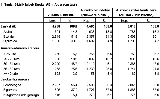 Jaiotzak amaren adinaren arabera banatzen baditugu, ikusiko dugu 3034 urteko amen taldea oraindik ere nagusi dela, eurak baitira erditzen direnen ia erdiak. Ondoren, goragoko taldea dago, hau da, 3539 urte artekoa (%25,6) eta 2529ko taldea beherago geratu da, erditzeen %18,5 ekarri baititu. Muturreko adinak dituzten taldeetan, 25 urtez behera amatu zirenak %5,3 izan ziren, eta 40 urtez gorakoen taldeak, berriz, jaiotzen %3,9 besterik ez zuen ekarri.