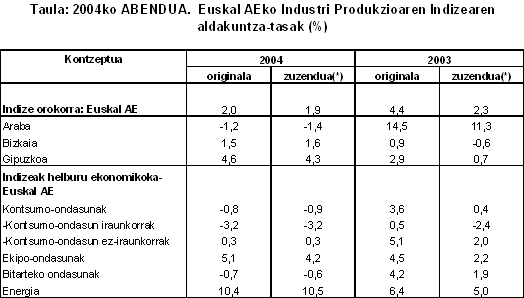 2004ko abenduan, urte arteko aldakuntzarik positiboenak, balio absolututan, sektore hauei egokitu zitzaizkien: energia elektrikoa, gasa eta ura (%21,2), metalezko eta ez-metalezko meak (%4,1), elikagai-industria (%4,1), garraio-materiala (%3,5) eta kautxua eta plastikoa (%2,7) arloei, besteak beste.
