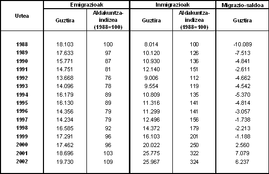 Atzerriko nazionalitatea duten inmigratzaileak, 2002. urtean, 12.184 pertsona izan dira, hots, aurreko urtean baino %7,3 gehiago, eta gure erkidegoko sarrera guztien %47 izan dira. 1988az geroztik, nabarmen gehitu dira atzerriko nazionalitatea duten immigranteen sarrerak Euskal Autonomia Erkidegoan. Kopuru absolututan, 500 sarrera ingurutik 12.000 pasara igo da 2002an, hau da, atzerritarren immigrazioak 24rekin biderkatu dira hamalau urtean. Kontuan izan behar da atzerriko immigranteetatik zenbait beste autonomia-erkidego batzuetatik etorri direla. Zehazki, 2002. urtean 3.389 kasutan gertatu zen hori.