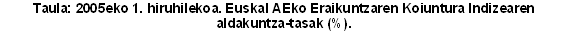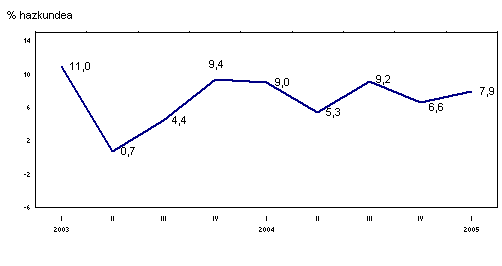 Eraikuntza-sektorearen bilakaera positiboa, 2005eko lehen hiruhilekoan, gehiago oinarritu zen eraikuntza azpisektorean, obra zibila azpisektorean baino. Izan ere, lehenak urte arteko % 9,9ko igoera izan zuen, eta bigarrenak, berriz, % 3,5ekoa, lan-egutegiaren eraginak zuzendu ostean.