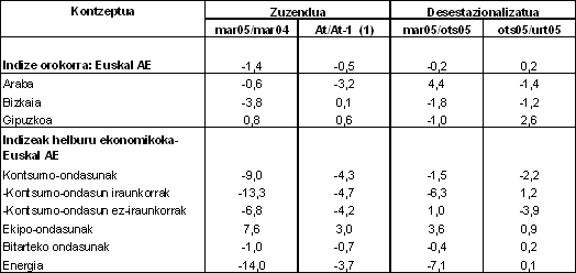 2005eko martxoan 2005eko otsailaren aldean izandako hilen arteko aldakuntza positiboa izan zen ekipo-ondasunetan (%3,6). Kontsumo-ondasunak hilen arteko %1,5eko jaitsiera izan zuten; horien barruan, kontsumo-ondasun ez-iraunkorrak %1,0 igo ziren aurreko hilaren aldean, eta kontsumo-ondasun iraunkorrak %6,3 jaitsi. Bitarteko ondasunak %0,4 jaitsi ziren eta energia %7,1.