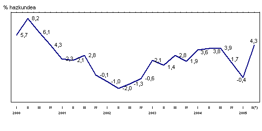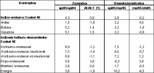 Sektoreen arabera, eta industri sektore nagusienak sailkatu ostean, 2005eko apirileko indizearen bilakaera hazi egin da sektore guztietan, 2004ko otsailarekin erkatuta. Kontsumo-ondasunak %6,8 hazi ziren, kontsumo-ondasun iraunkorrak eta kontsumo-ondasun ez iraunkorrak ere hazi egin zirelako (%7,3 eta %6,6, hurrenez hurren). Ekipamenduko ondasunak %5,6ko urte arteko tasarekin hazi ziren, Tarteko ondasunak %2,9rekin eta Energia %3,6rekin.