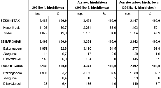 Ezkontzak ezkontideek eztei-egunean zuten adinaren arabera banatuz gero, 2004ko laugarren hiruhilekoan, senarren artean, %73,1ek 30 urtetik gora zituzten; emazteen artean, berriz, %54,3k. Aurreko urteko hiruhileko beraren aldean, proportzioa 2 ehuneko-puntu altuagoa izan zen senarren kasuan, eta ia berdina emazteenean.