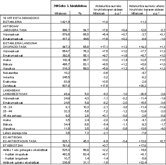 Okupazio-tasa, 16tik 64 urtera bitarteko biztanle-kopuruaren gainean landunek duten ehunekoa, %65,8koa izan zen, hots, hiru hilabete lehenago baino 1,3 ehuneko-puntu gehiago. Tasa hau, gizonezkoetan, %76,3koa izan zen, eta emakumezkoetan, berriz, %55,1ekoa baino ez.