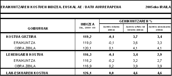 Sektoreak kontsumitutako lehengaien artetik, azken hamabi hilabeteetan, hauek izan zituzten inflazio-tasarik handienak: asfalto-produktuak (%32,1), petroliotik eratorritakoak (%31,9), olioak eta koipeak (%7,4), lur erreak (%6,4), esku-erremintak (%6,3) eta harri elaboratua (%6,2) lehengaiek. Aitzitik, urteko arteko prezioetan murrizketak izan zituzten energia elektrikoa (%-3,4), bulego-materiala (%-2,9), egitura metalikoak eta galdaragintza (%-0,8) eta karea, igeltsua eta eskaiola (%-0,5) lehengaiek.