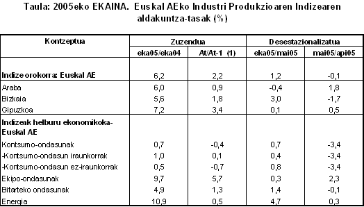 EUSTATek landutako datuen arabera, 2005eko ekainean, lan egutegiko termino homogeneotan % 6,2 hazi zen Euskal AEko industri produkzioa, 2004ko hil beraren aldean. Urtearen lehenengo sei hilabeteetan industri jarduera % 2,2 hazi zen, aurreko urteko aldi berarekin alderatuta.