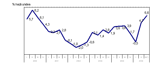EUSTATek landutako datuen arabera, 2005eko uztailean, lan egutegiko termino homogeneotan %6,6 hazi zen Euskal AEko industri produkzioa, 2004ko hil beraren aldean. Datu horrek baieztatu egin zuen urtearen bigarren hiruhilekoan nabaritu zen susperraldia (%+4,7), urtearen lehenengo zazpi hilabeteetan %2,9 hazi baitzen industri jarduera, aurreko urteko aldi beraren aldean.
