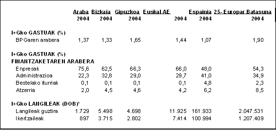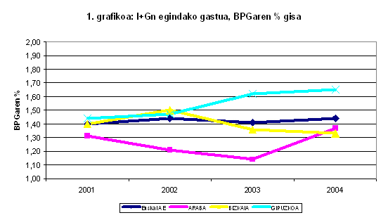 Arabak egindako ahalegina I+Gko gastua BPG bezala alderatzean ikus daiteke, izan ere Euskal Autonomia Erkidego osoan balio hori %1,44koa izan zen. 2003. urtean Araban %1,14koa izan zen adierazle hori eta 2004. urtean %1,37koa; Gipuzkoan %1,65ekoa izan zen eta Bizkaian %1,33koa. Horrela, hiru lurraldeetako adierazleek gainditu zuten Espainiako batez bestekoa (%1,07).