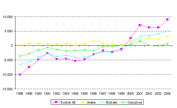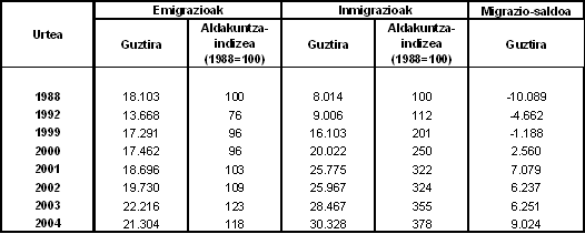 Euskal Autonomia Erkidegoaren eta gainerako autonomia-erkidegoen arteko mugimenduak bakarrik kontuan hartuz gero, 2004. urtean aurrekoan baino 380 pertsona gutxiago etorri ziren; hau da, bosten bat baino gehixeago gutxitu zen. Horrenbestez, Euskal Autonomia Erkidegoaren eta gainerako autonomia-erkidegoen arteko migrazio-saldoa oraindik negatiboa da, 2.640 pertsonako galera izan baita. Bestalde, atzerriko herrialdeetako etorkinen migrazio-saldoa positiboa da; 11.664 pertsona gehiago dago eta horrek, aurreko urtekoaren aldean, %20ko gehikuntza ekarri du.