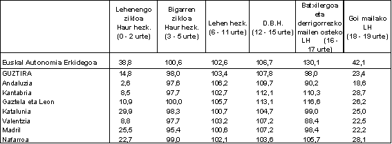 Halaber, titulartasunari dagokionez, 2004-05 ikasturtean 259.320 ikasle egon ziren guztira zentro publikoetan; hau da, kopuru hori aurreko urtekoa baino %3,2 handiagoa izan zen. Hona hemen gehikuntzak izan zituzten irakaskuntzak: haur hezkuntza (%16,4), lehen hezkuntza (%2), helduentzako hezkuntza (%12) eta araubide bereziko irakaskuntzak (%3,1). Gainerako irakaskuntzetan (batxilergoa, lanbide heziketa eta unibertsitateko ikasketak) 2003/04 ikasturtean baino ikasle gutxiago izan zen. Zentro pribatuetan %1,5eraino gutxitu zen matrikulazio kopurua; haur hezkuntzan (%5,6) eta maila ertaineko prestakuntzan (%2,1) eman zen salbuespen bakarra, bi hauetan aurreko urtean baino ikasle gehiago izan baitzen. Gainerako irakaskuntzetan, guztira, ikasle gutxiago izan zen.