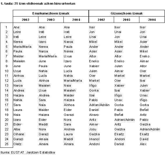 Izen euskaldunak dira nagusi, eta batzuk idazkera ezberdinekin erregistratzen dira, esate baterako: Ane-Anne, Itxaso-Itsaso, Leire-Leyre, Jon-Ion, Aritz-Haritz. Ion izan ezik, izen bera bi eratara adierazteko forma horiek guztiak 100 ohikoenen barruan daude.