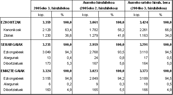 2005eko uztailean, abuztuan eta irailean guztira 3.359 ezkontza egin ziren Euskal Autonomia Erkidegoan, hau da, aurreko urteko hiruhileko beraren aldean kopuru hori %2 gutxitu da. Bizkaian 1.754 ezkontza egin ziren, aurreko urteko aldi berean baino %1 gutxiago, eta Gipuzkoan 1.043 ezkontza, aurrekoan baino %4 gutxiago; soilik Araban gehitu zen ezkontzen kopurua, 438 egon zirelako, hau da, aurreko urteko aldi berean baino %5 gehiago. Euskal Autonomia Erkidegokoak ez diren egoiliarren arteko ezkontzak 138ra gehitu ziren.