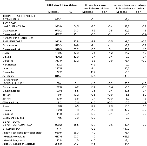 Lehenengo hiruhileko honetan, langabetu-kopurua 50.400 dela uste da, hau da, orain dela hiru hilabete baino 1.300 pertsona gehiago. Lan bila ari diren, lana bilatzeko kudeaketa aktiboak egiten dituzten eta lanerako prest dauden pertsonak jotzen dira langabetutzat. Lurralde historikoen arabera, Araban guztira 6.600 langabetu daude, 2.900 pertsona gehiago beraz eta %4,5eko tasara helduz; Gipuzkoan duela hiru hilabete baino 300 langabetu gehiago dago, baina hala ere hiru lurralde historikoetako tasa onena du (%3,3). Bizkaian 32.800 langabetu daude, duela hiru hilabete baino 1.900 gutxiago; baina oraindik langabezia-tasa altuena du (%6,3).