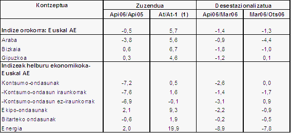 2006ko apirilean, eta 2006ko martxoaren aldean, Euskal Autonomia Erkidegoko industri produkzioa %1,4 murriztu da baina estazionalitate-ondorioak zuzendu ostean. Beraz, martxoko desazelerazioa (%-1,3) apirilean ere eman da (%-1,4).