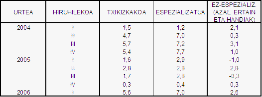 Txikizkako merkataritza espezializatuan, urte arteko hazkundeko tasarik handiena pertsonen hornikuntzako sektoreari dagokio. %14,3ko hazkunde nominala izan du; termino errealetan, %13,5ekoa. Etxearen hornikuntzako ondasunek ez dute hain hazkunde nabarmena izan; horien hazkundea %1,5ekoa izan da termino nominaletan; tasa hori %0,3koa da, gainera, (positiboa hau ere) termino errealetan. Elikagaien salmentak %1,8 gehitu ziren urteko eurotan, baina %1,8 gutxitu ziren termino errealetan. Beste alde batetik, Bestelako Kontsumo Ondasunen partidak (kirolak, jolasak, optikak eta liburu-dendak, besteak beste) %5,8ko hazkunde nominala izan zuen; produktu horien prezioen deflazio-efektuaren ondorioz, baina, termino errealetan, tasa hori %6,8 bihurtu zen.