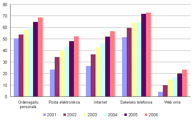 EUSTATen datuen arabera, euskal enpresetako IKT teknologietako (Informazioaren eta Komunikazioaren Teknologiak) ekipamendu kopuruak gora egiten jarraitu du 2006. urtean; hain zuzen ere, ekipamendu horiek %4 gehitu dira. Salbuespen bakarra sakelako telefonoak dira, hauek 1,1 puntu gehitu baitira.