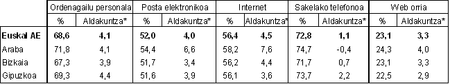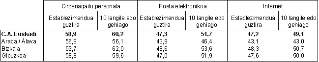 Teknologia horiek erabiltzen dituzten langileen kopurua ere nabarmen gehitu da. Langileen %59ak ordenagailua erabiltzen du; Internet %47,1ak eta posta elektronikoa %47,4ak. Kasu honetan, eta aurrerago lurralde bakoitzeko establezimenduak alderatu direnean gertatzen ez den bezala, Bizkaian dago teknologia horiek erabiltzen dituen langile kopuru handiena. Gero Gipuzkoa eta Araba daude.