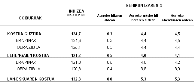Ekainean, prezioen hazkunde handienak, besteak beste, ondoko hauetan kontsumitutako lehengaietan eman dira: asfaltozko produktuak (%4,4), burdina eta altzairua (%1,9), metalezko tutueriak (%1,3) eta energia elektrikoa (%1,0). Ondoko hauetako lehengaien prezioak, berriz, gutxitu egin dira, besteak beste: olioak eta koipeak (%-1,0), beira (%-0,7), zementu artifiziala (%-0,2) eta erauzketa-agregakinak (%-0,1).