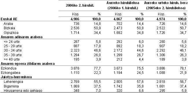 Jaiotza-hurrenkeraren arabera, 2006ko bigarren hiruhilekoan jaioen erdiak baino gehiago, hots, 2.769 ume, lehenengo seme-alabak izan ziren; 1.869 ume (%37,5) aurretik beste bat zegoen familietara iritsi ziren; eta hirugarren eta ondorengo seme-alabak %7ra iritsi ziren. Bizkaian (%42,2), bigarren eta ondorengo seme-alaben kopurua Euskal AEko batez bestekoa (%44,5) baino txikiagoa izan zen, eta hori herrialde historiko horretan baino ez zen gertatu. Aitzitik, Araban eta Gipuzkoan ehuneko hori gainditu egin zen, %45,7ko eta %47,3ko ehunekoak izan baitzituzten, hurrez hurren.