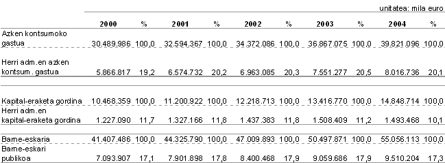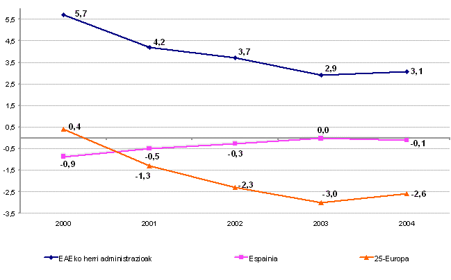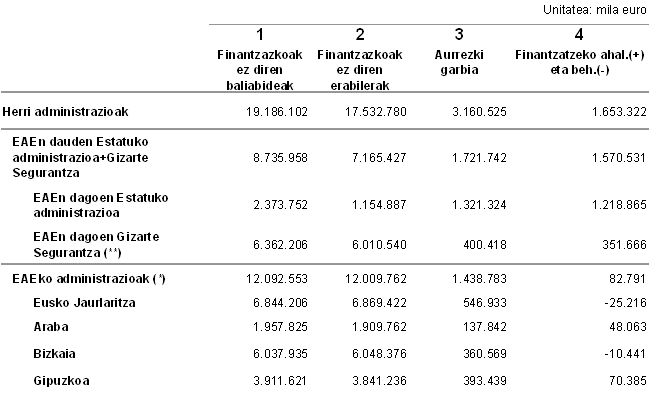 EUSTATen datuen arabera, Euskal Autonomia Erkidegoan dauden herri administrazioek (euskal administrazioak eta EAEn kokatuta dauden Estatuko administrazioa eta Gizarte Segurantza), 2004. urtean, 1.653 milioi euroko superabita izan zuten finantzatzeko ahalmenari dagokionez, hau da, BPGaren %3,1. 2000 eta 2003 urteen arteko aldian ratio hori uzkurtu egin da: 2000. urtean %5,7koa zen eta 2003an %2,9koa. Aitzitik, 2004. urtean bi hamarren igo zen.