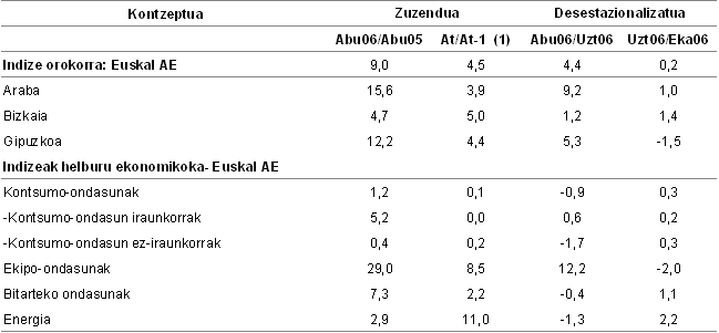 Sektoreen arabera, eta industri sektore nagusienen sailkapena kontuan hartuta, 2006ko abuztuko indizearen bilakaerak (2005eko abuztuaren aldean) aldaketa positiboak izan ditu sektore guztietan: ekipamenduko ondasunak %29,0 hazi dira; tarteko ondasunak %7,3 igo dira; energia %2,9 igo da, eta kontsumoko ondasunak %1,2 igo dira, kontsumo-ondasun iraunkorrek eta kontsumo-ondasun ez iraunkorrek izandako gehikuntzen ondorioz (%5,2 eta %0,4 hurrenez hurren).