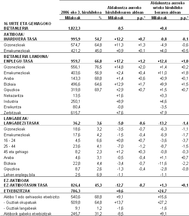 Langabetu-kopurua hirugarren hiruhileko honetan 36.200 dela uste da, hau da, orain dela hiru hilabete baino 5.000 pertsona gutxiago. Lan bila ari diren, bilaketako kudeaketa aktiboak egiten dituzten eta lanerako prest dauden pertsonak jotzen dira langabetutzat. Lurralde historikoka, Araban 4.600 langabetu daude, hau da, 500 pertsona gutxiago eta tasa %3,1era jaitsiz. Bizkaian 22.800 langabetu daude, duela hiru hilabete baino 3.400 gutxiago, baina oraindik tasa txarrena du (%4,4); Gipuzkoan, duela hiru hilabete baino 1.300 pertsona inguru gutxiago dago langabezian eta lurralde horrek du tasarik onena (%2,6).