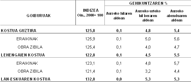 Sektoreak kontsumitutako lehengai garrantzitsuenen artetik, azken hamabi hilabeteetan, hauek izan dituzte inflazio-tasarik handienak: energia elektrikoa (%25,8); burdina eta altzairua (%16,6); beira (%9,2); metalezko hoditeria (%8,9); eta leherkariak eta gasak (%5,1). Bestalde, urte arteko prezioetan (2006ko urria, 2005eko urriarekin alderatuta) honako lehengai hauek izan dituzte jaitsierak edota igoera txikiagoak: petroliotik eratorriak (%-9,5); karea, igeltsua eta eskaiola (%-2,2); zeramika-produktuak (%-0,1); harri elaboratua (%0,0); aparatu eta material elektrikoak (%0,0); eta egurra eta kortxoa (%1,0).