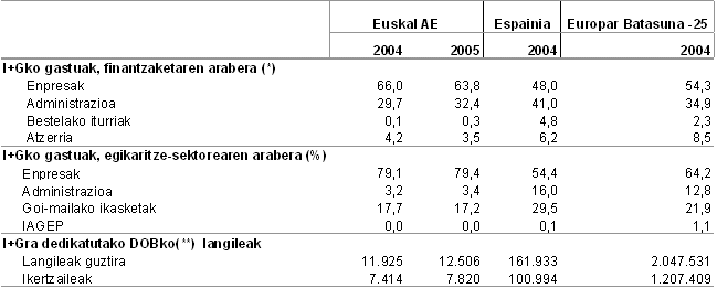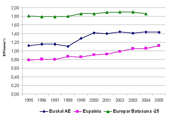 Egiaztatu da erlazio positiboa dagoela biztanleko BPGaren eta I+Gra bideratutako BPGaren ehunekoen artean. Herrialde aberatsenek egiten dute I+Gko inbertsiorik handiena, hau da, euren BPGaren %2,5 gainditzen dutenak: Suediak, Finlandiak, Japoniak, Islandiak, Suitzak, Estatu Batuek eta Alemania. Bitarteko ahalegina egiten dutenen artean, hots, BPGaren %1,5en eta %2,5en artekoa egiten dutenen artean, Danimarka, Austria, Frantzia, Belgika, Erresuma Batua, Holanda, Luxenburgo eta Norvegia daude. I+Gko inbertsio baxuenak, azkenik, Irlandan (%1,20), Italian (%1,11), Espainian (%1,12), Hungarian (%0,89), Portugalen (%0,74) eta Polonian (%0,56) izaten dira.