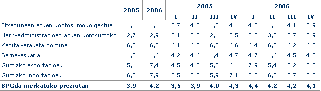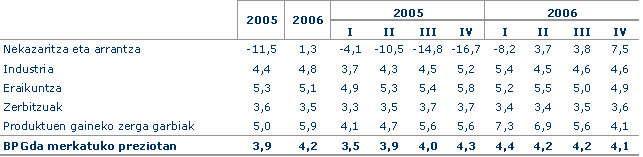 Eustatek landutako datuen arabera, Euskal AEko ekonomiak sortutako BPGak %4,1eko hazkunde erreala izan du 2006ko laugarren hiruhilekoan, 2005eko aldi beraren aldean. Urte arteko hazkunde-tasa hori Espainiako ekonomian lortu dena baino hamarren bat handiagoa da (%4,0) eta EB-27n eta Estatu Batuetan lortutakoa baino zazpi hamarren handiagoa (%3,4).