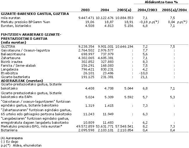 Emaitza horiek eta Estatu osokoak alderatuz gero, azterketa ezberdinak egin daitezke. Alde batetik, Euskal AEko biztanle bakoitzeko gizarte-prestazioetan egindako gastua, guztira, Estatuan egindakoa baino %9 handiagoa izan zen 1995ean. 2004. urtean, ostera, %22 handiagoa izatera iritsi zen. Bestalde, gizarte-babesean egindako ahalegina 2004ko BPGarekiko proportzioan neurtuta, Euskal AEn biztanleen gizarte-babeserako gastua %18,9koa izan zen guztira. Estatuan, aldiz, gastu hori %19,5ekoa izan zen.