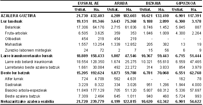 Euskal AEko ustiategiak 2003ko 22.234 izatetik 2005eko 21.730era pasa dira, hau da, %2,3 gutxiago. Nekazaritzako azalera guztia zein nekazaritzako azalera erabilia (lur landuak eta larre iraunkorretarako lurrak) apenas aldatu dira 2003. urtearen aldean: %0,5 gehitu dira lehenengoak eta %0,5 gutxitu bigarrenak, Eustatek landutako datuen arabera.