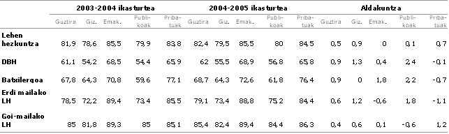 2004-05 ikasturtea gainditu zuten ikasleen datuak hauek dira: haur hezkuntzan 41.190 ikaslek gainditu zuten, hau da, %82ak; DBHn 43.305 ikaslek, %61ak; batxilergoan 20.750 ikaslek amaitu zituzten bere ikasketak (%68) eta, azkenik, Lanbide Heziketako bi zikloetan guztira 10.643 ikaslek amaitu zituzten ikasketak, hau da, batez beste %82ak gainditu zuen.