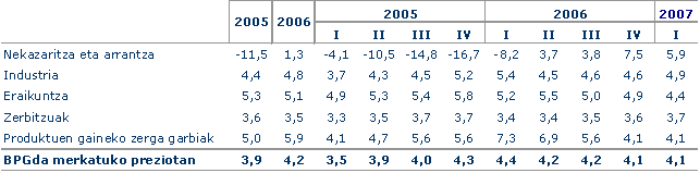 Zerbitzuen Sektorean hamarren bateko hazkundea dugu lehengo hiruhilekoaren aldean, tasa %3,7koa delarik. Bestalde, Merkatuko Zerbitzuetan urte arteko %3,9ko hazkundea dugu, 2006ko laugarren hiruhilekoan baino hamarren bat gehiago; halere, hiruhilekoen arteko profila %1,2tik %0,5era pasatzen da. Ez-Merkatuko Zerbitzuetan urte arteko goranzko bilakaera dugu, %2,8koa; baina hiruhilekoen arteko tasetan beheranzkoa, lehengoan %1,2 eta oraingoan %0,3.
