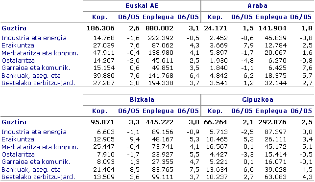 Eustatek egin dituen datuen arabera, 2006. urtean Euskal Autonomia Erkidegoan jarduten zuten enpresek -lehen sektorekoak izan ezik- 186.306 establezimendutan (fabriketan, dendetan, bulegoetan...) burutu zuten euren jarduera eta 880.002 pertsonari eman zien lana, hau da, aurreko urtean baino %3,1 gehiagori. 2001. urteaz geroztik 120.419 pertsona gehiago egon zen lanean Euskal Autonomia Erkidegoan, %3,0ko batez besteko urteko tasa pilatuarekin.